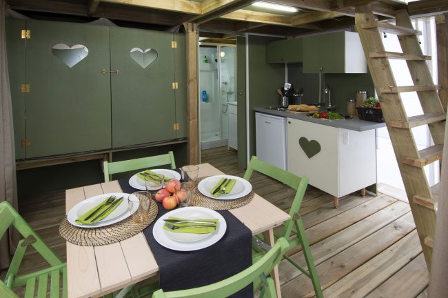 MOBILEHOME fino a 4 persone. Tutte un angolo cottura attrezzato, cuscini, coperte e veranda esterna con tavolo e sedie.