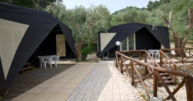 tende eleganti con cucina attrezzata, bagno con box doccia, tv, spazio esterno