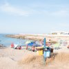 Spiaggia con ombrelloni colorati e persone che prendono il sole.