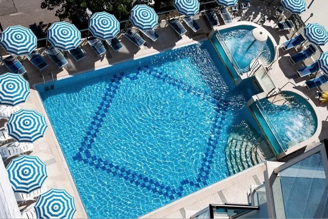 Vista dall'alto di una piscina con ombrelloni a righe blu e bianche disposti intorno.