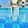 Piscina azzurra all'aperto con ombrelloni e lettini sullo sfondo.