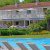 Una piscina con ombrelloni, palme e arbusti in fiore, vista su colline lussureggianti.
