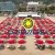 Un bar all'aperto con sedie rosse e ombrelloni, accanto a una palma e un'area pavimentata.