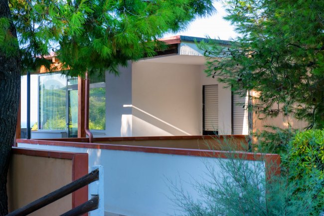 Porta aperta su una veranda con tavolo apparecchiato e ringhiera bianca immersa nel verde.