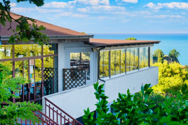 Ristorante con tavoli e sedie in legno, vista mare attraverso un'ampia apertura.