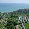 Vista aerea di un campeggio vicino alla costa, circondato da verde e colline.