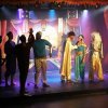 Una scena teatrale con attori in costumi colorati su un palco illuminato.