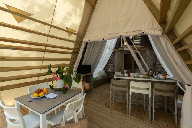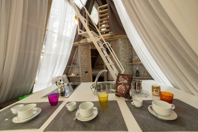 - GLAMPING fino a 4 posti letto, 41 mq inclusa veranda esterna, suddiviso du 2 piani, zona giorno con angolo cottura, 2 camere, 1 bagno con doccia.