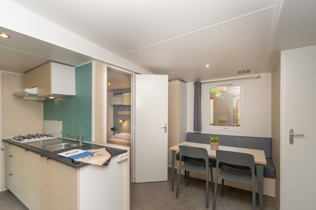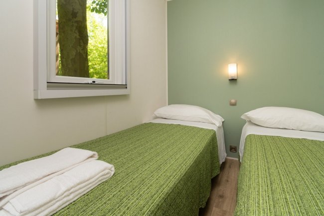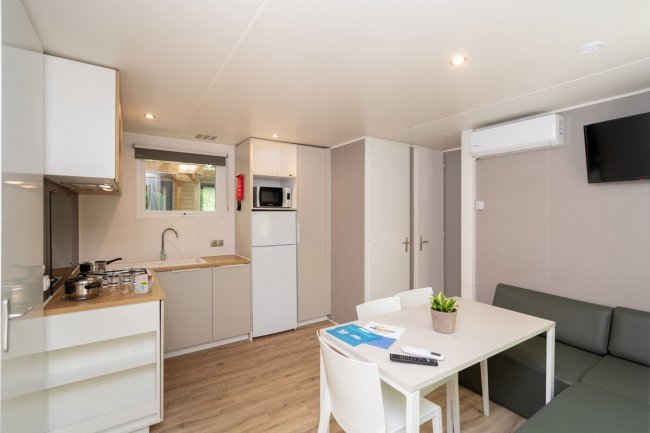 - MOBILE HOME QUADRILOCALI: fino a 7 posti letto, 48 mq con veranda inclusa, zona giorno con angolo cottura, 3 camere, 1 bagno con doccia.