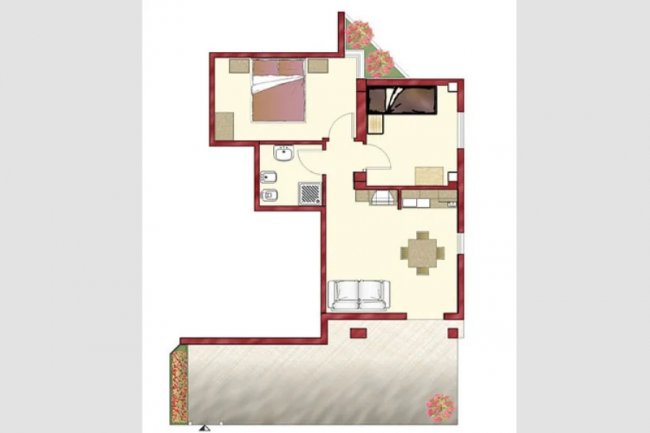 Piantina appartamento con salotto e camera.