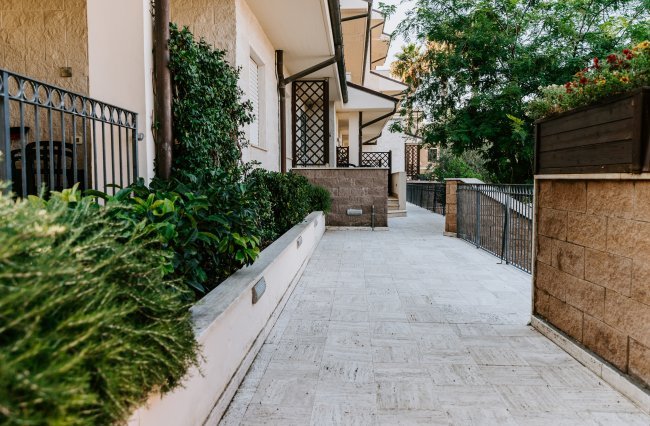 Vialetto esterno con piante verdi.